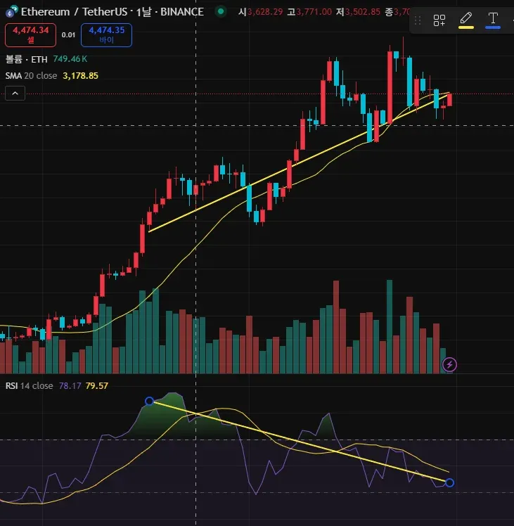 가격은 올라가지만 RSI는 낮아지는 현상을 발견 (=하락 다이버전스)