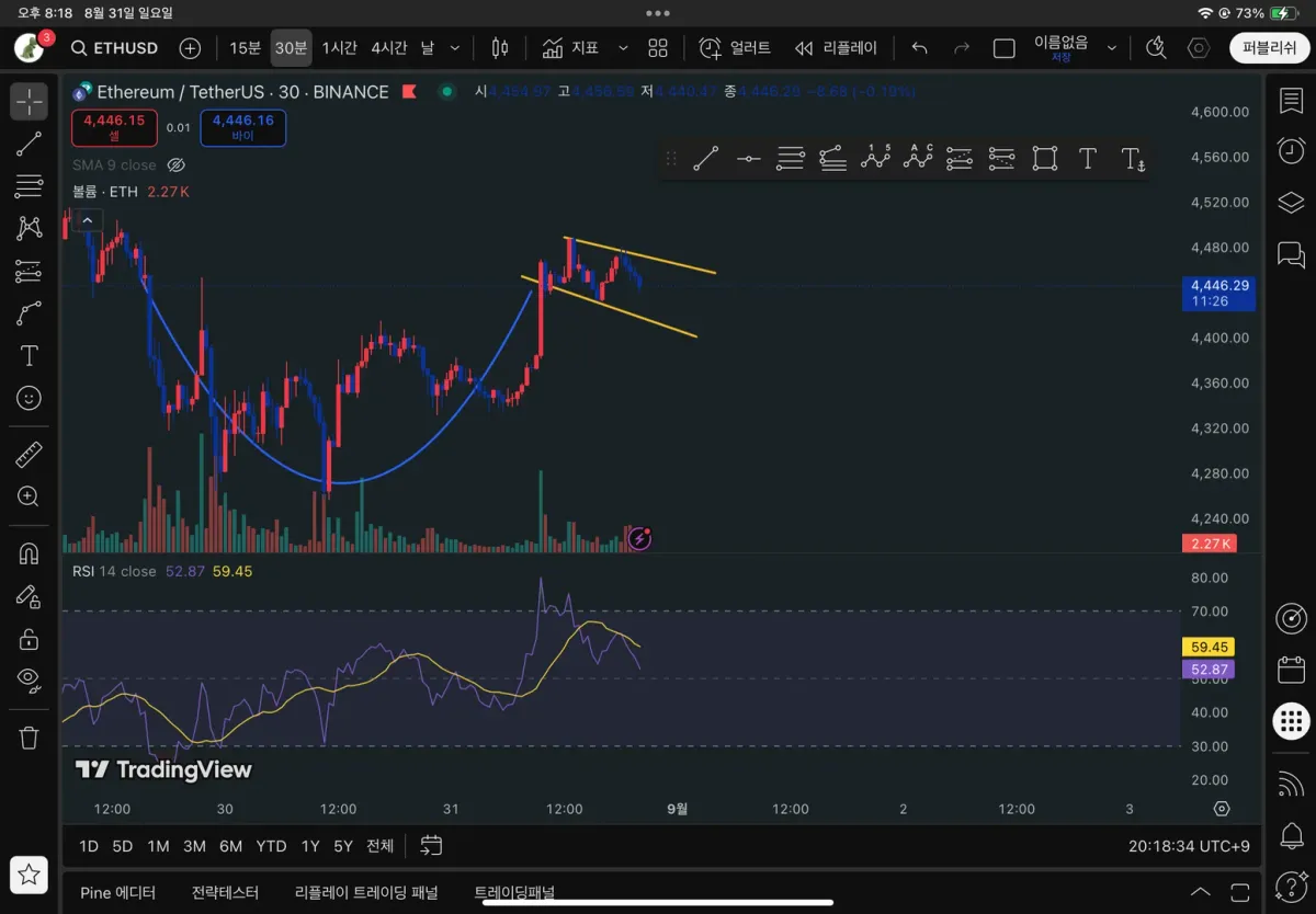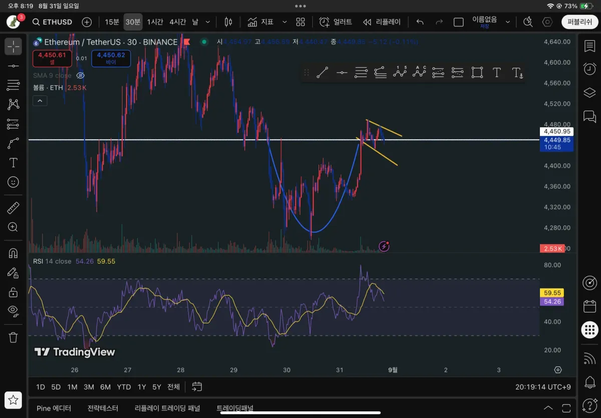 그래서 핸들 부분에 추세선을 긋고 지켜보고 있습니다. 우선 작도한 추세선에 가격이 접하는 것을 보았기 때문에 유효한 추세선이었다고 판단하고 우선 25프로 정도를 매도했습니다. 아래쪽 추세선에 가격이 다시 닿을 때 다시 매수했다가 큰 상승폭이 나오면 상승세가 어느정도 끝날때쯤 매도, 추세선을 이탈하면 손절하려는 계획입니다..!
