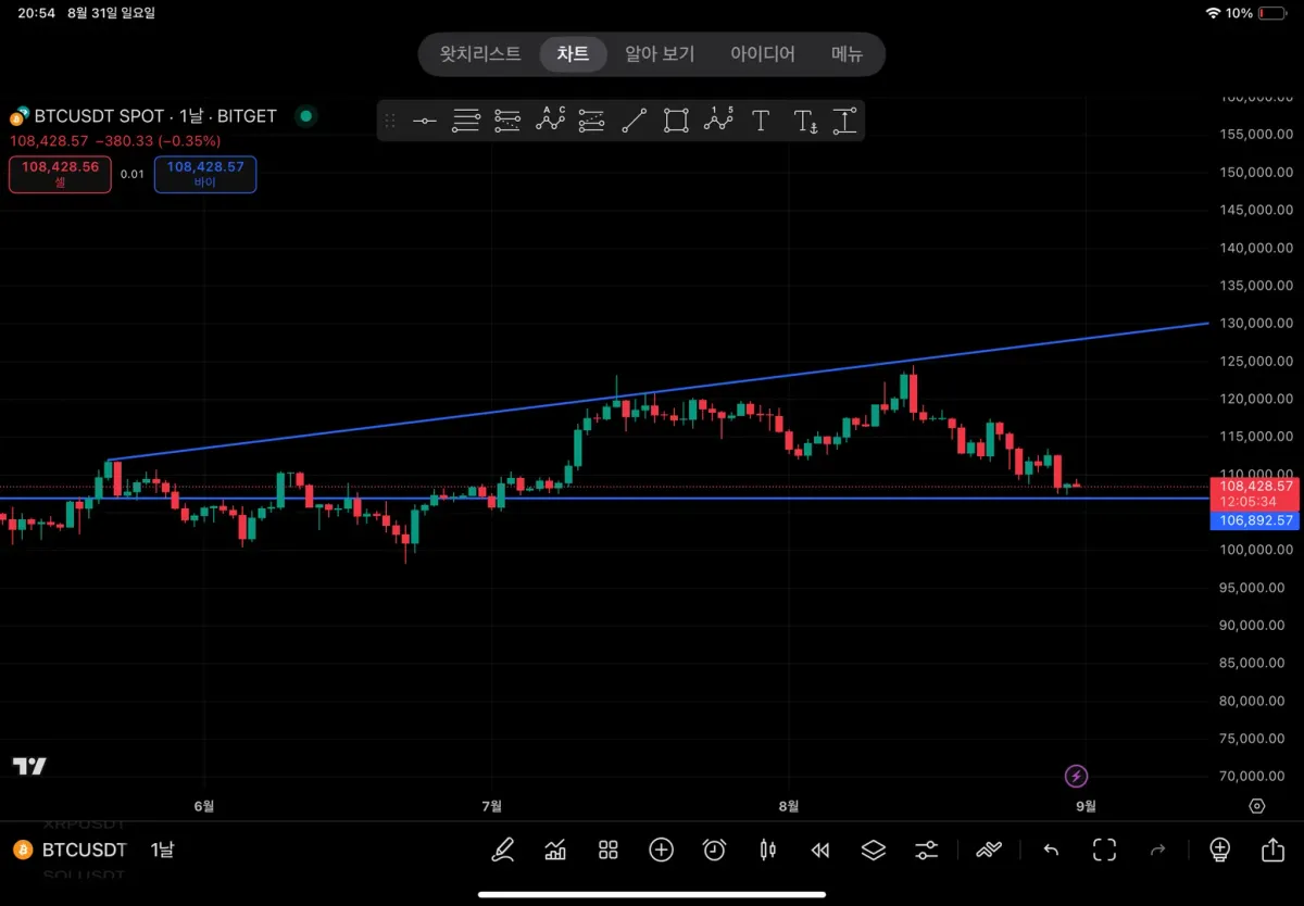처음 작도를 해보았습니다 현재 지지선에 걸려있고, 지지선 밑으로 내려가면서 하락할 것으로 생각이 됩니다