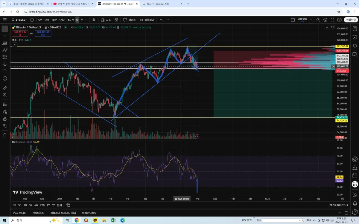 라이징 웻지 패턴과 더블탑 패턴이 보여 더 내려갈 것이라 예측이되는데