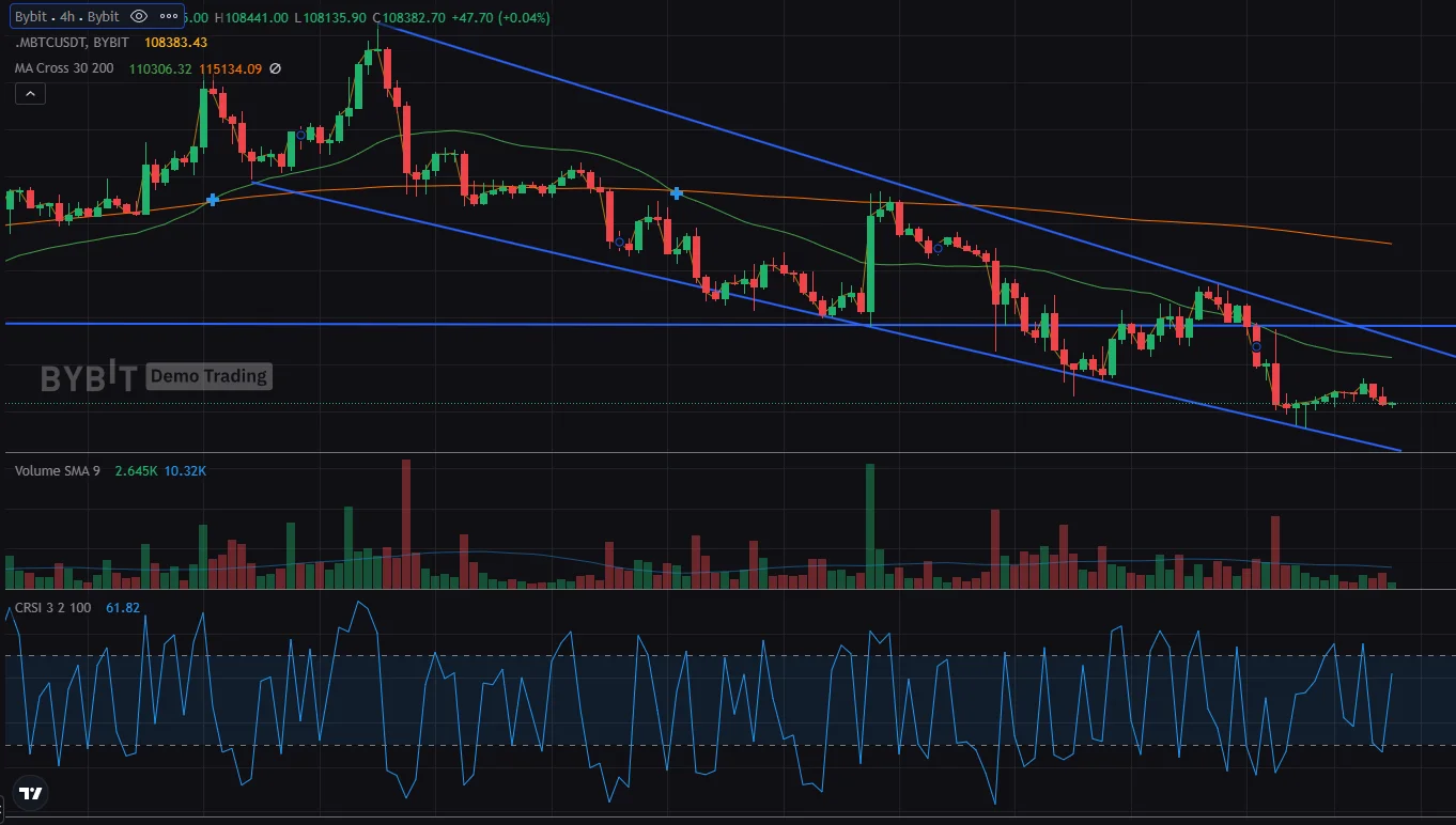 이동평균선을 30일 200일선 비교 결과 데드크로스가 나왔고, 저항선이 뚫렸고, 폴링웻지 패턴을 확인하여, 데모 매매를 진행하지 않았습니다만, 다시 매집구간이 있어, 조금 더 시장을 관망한 뒤