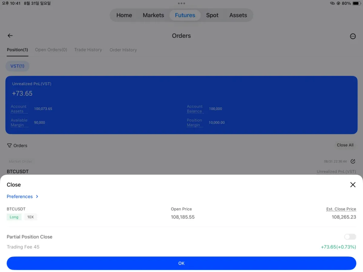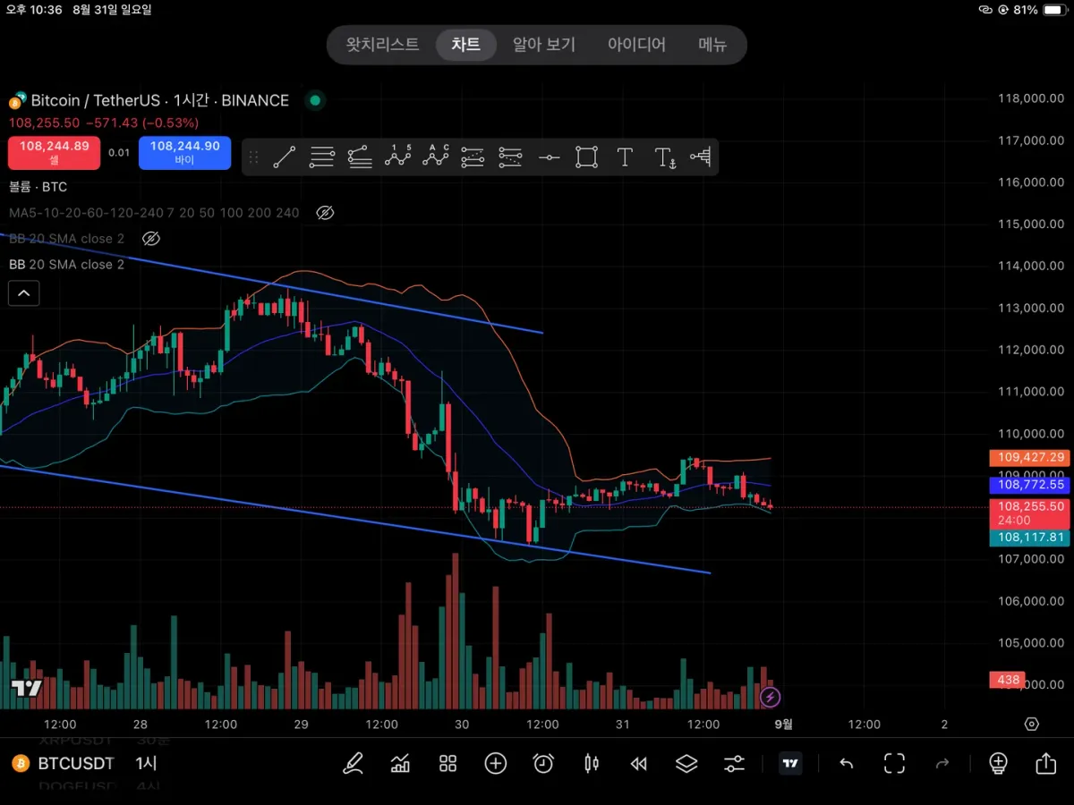 트레이딩뷰를 사용하여 1시간봉에서 볼린저밴드와 추세선을 활용하여 추세선의 지지와 저항을 잘 받고 있었으며 볼린저밴드의 하단선과 상단선을 벗어나지 않고 진행되고 있음을 확인하여 하단선을 치고 올라갈때 10배 레버리지로 진입했으며 이동평균선을 넘는걸 확인하고 익절을 하였습니다.