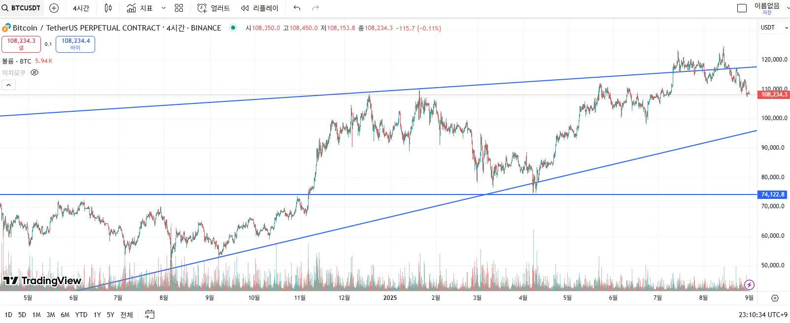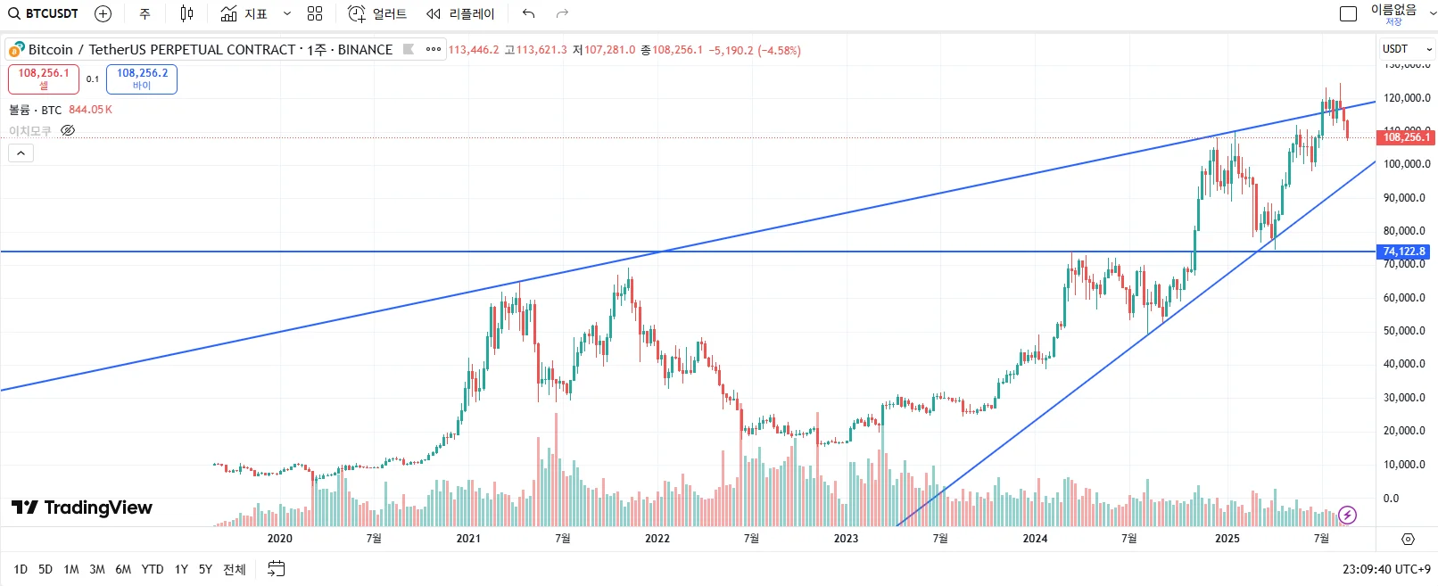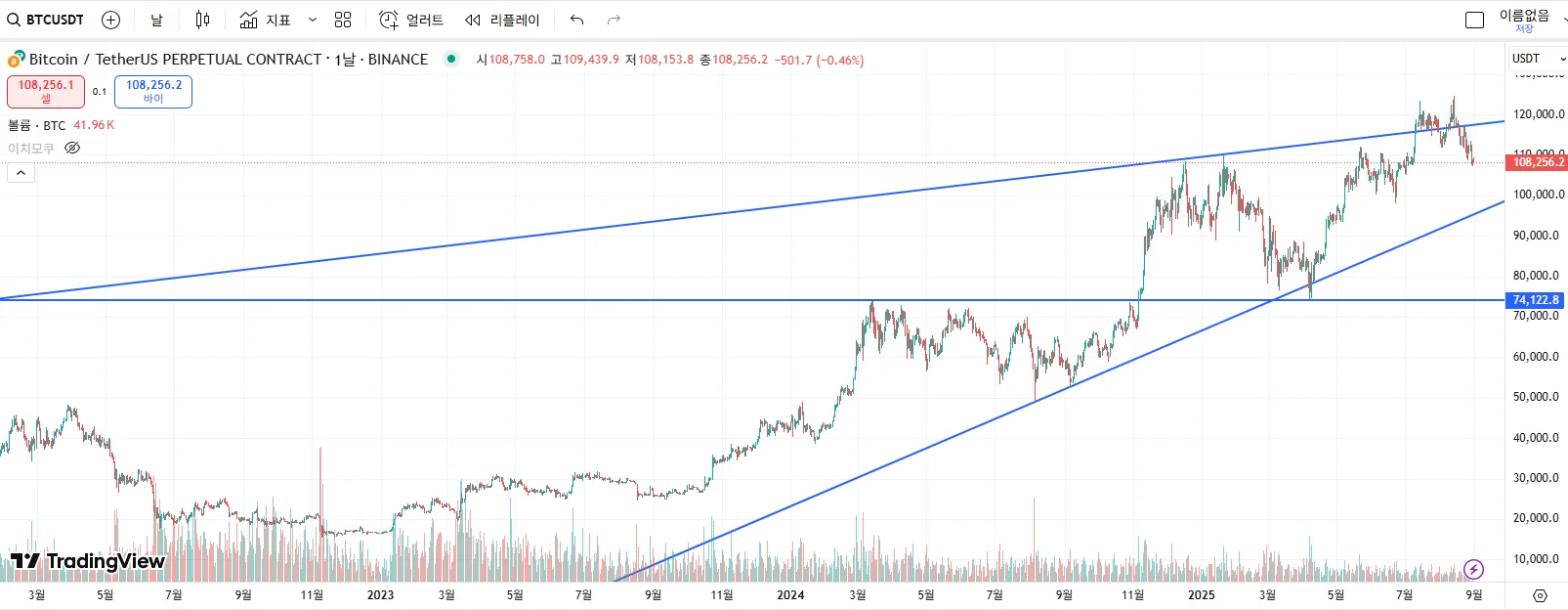 현재 비트코인은 장기 상승 추세라는 큰 틀 안에 있지만, 최근 강력한 장기 저항선에 막혀 단기적인 하락 조정을 겪고 있다. 따라서 지금 당장 매수하기보다는, 가격이 하단의 상승 추세선이나 중요한 수평 지지선까지 내려와서 지지를 받는지 확인하고 진입하는 것이 더 안전한 전략으로 보인다. 만약 상단의 저항 추세선을 강력하게 돌파한다면, 그때는 새로운 상승 추세의 시작으로 보고 추격 매수를 고려해볼 수 있다.