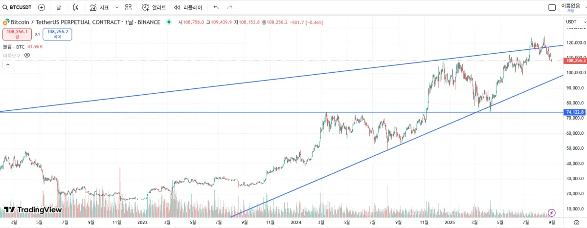 현재 비트코인은 장기 상승 추세라는 큰 틀 안에 있지만, 최근 강력한 장기 저항선에 막혀 단기적인 하락 조정을 겪고 있다. 따라서 지금 당장 매수하기보다는, 가격이 하단의 상승 추세선이나 중요한 수평 지지선까지 내려와서 지지를 받는지 확인하고 진입하는 것이 더 안전한 전략으로 보인다. 만약 상단의 저항 추세선을 강력하게 돌파한다면, 그때는 새로운 상승 추세의 시작으로 보고 추격 매수를 고려해볼 수 있다.
