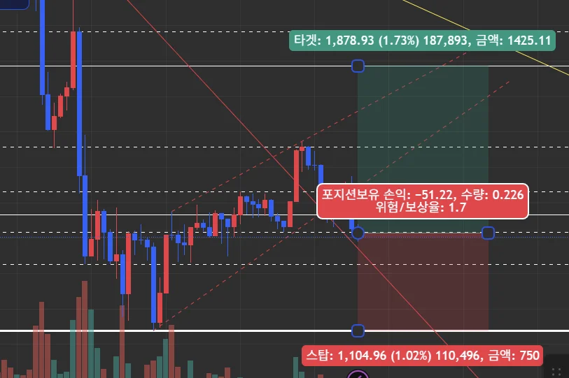 결과 : 실패. 스탑 라인에서 손절. - 상승 예측했는데 하락추세선 따라서 계속 하락함... 이미 상승라인에서 벗어난 곳에서 시작했는데 왜 상승으로 예측했을까...?