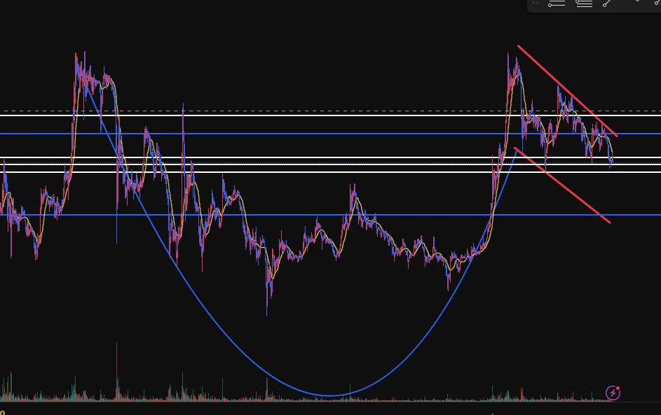 맞는건지 모르겠지만 컵앤 핸들 모양과 유사하여 우측 지지선 도달 시 매수 예정입니다