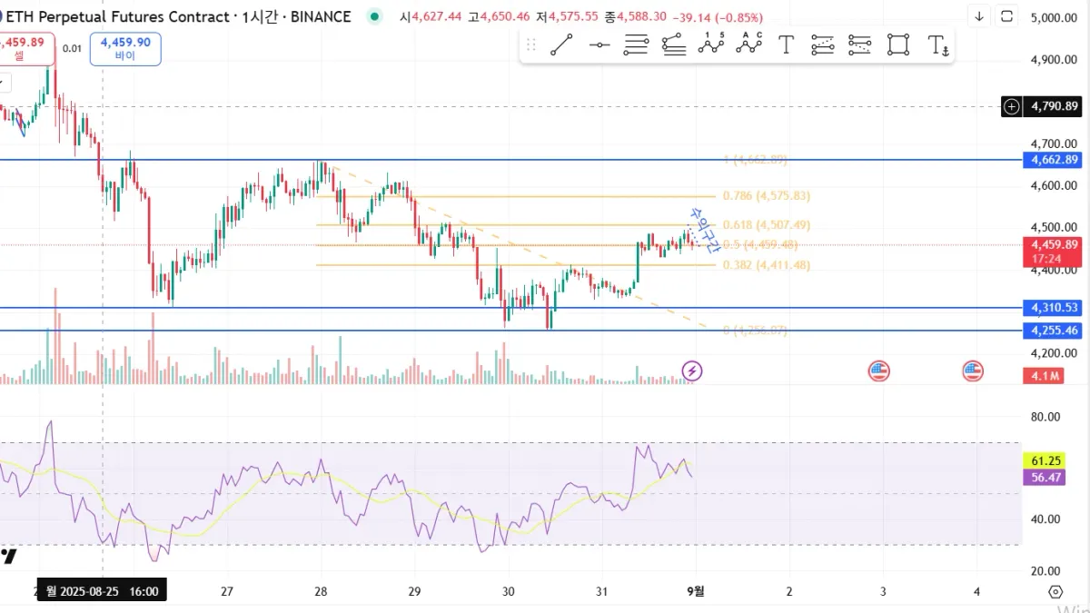 피보나치 0.618 구간 돌파 못한다고 생각하여 숏 진입하였고 0.5 구간에서 지지하는 것을 보고 짧게 수익 냈습니다.