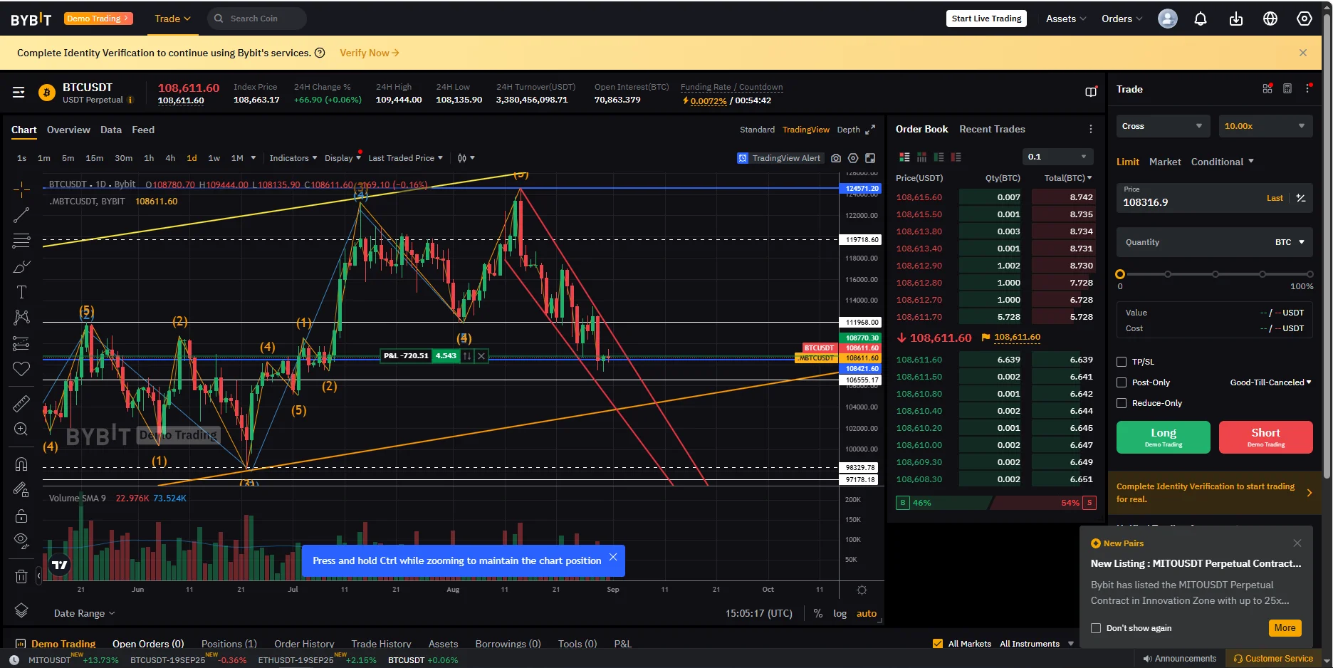 1시간봉에서의 저항선(흰색 점선)을 단기적인 스탑로스로 잡고 이 선을 넘을 시 손절(가볍게 트레이딩을 해보기 위해), 추세가 좋아 계속 고점을 갱신할거 같으면 노란색 추세선(일봉의 추세선)에서 분할익절하고 추후 삼각수렴 할 것을 고려해 리터치 후에도 상방돌파를 못하면 최종 익절할 계획이었습니다.