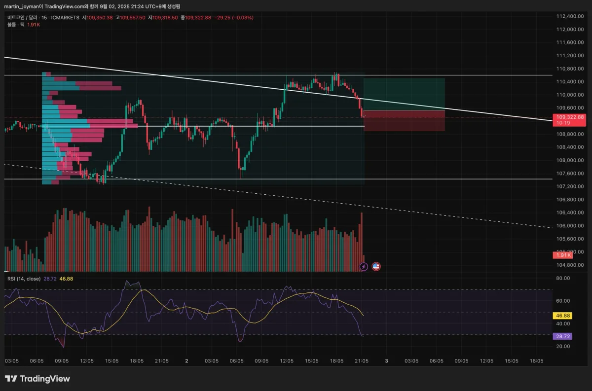 볼륨 프로파일 지지선아래로 손절가 세팅했고, 전고점 아래로 익절가 세팅했습니다....만