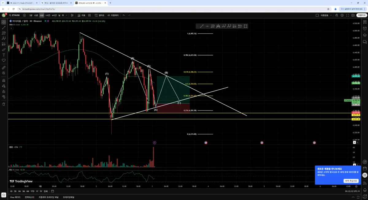 엘리어트 파동 중 3파가 나온 것 같았고 4파 하락 5파 상승 A가 나와 B파 상승을 예측하였습니다