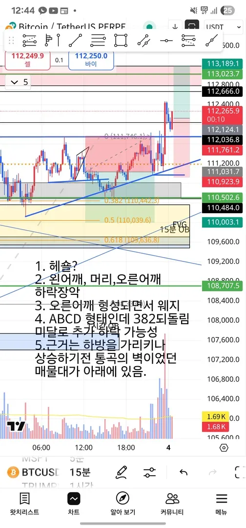 4) 숏을 봐야겠다 생각했던것이 이전에 ABCD패턴 이후 조정세가 나왔지만 382되돌림에 살짝 미달하여 추가하락이 있을수도 있겠다 생각.