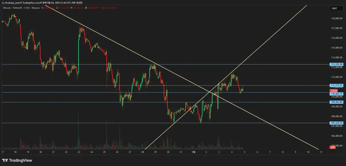 제일 저점의 지지선은 107K 이고, 109,110,111K의 그 다음 지지선들.