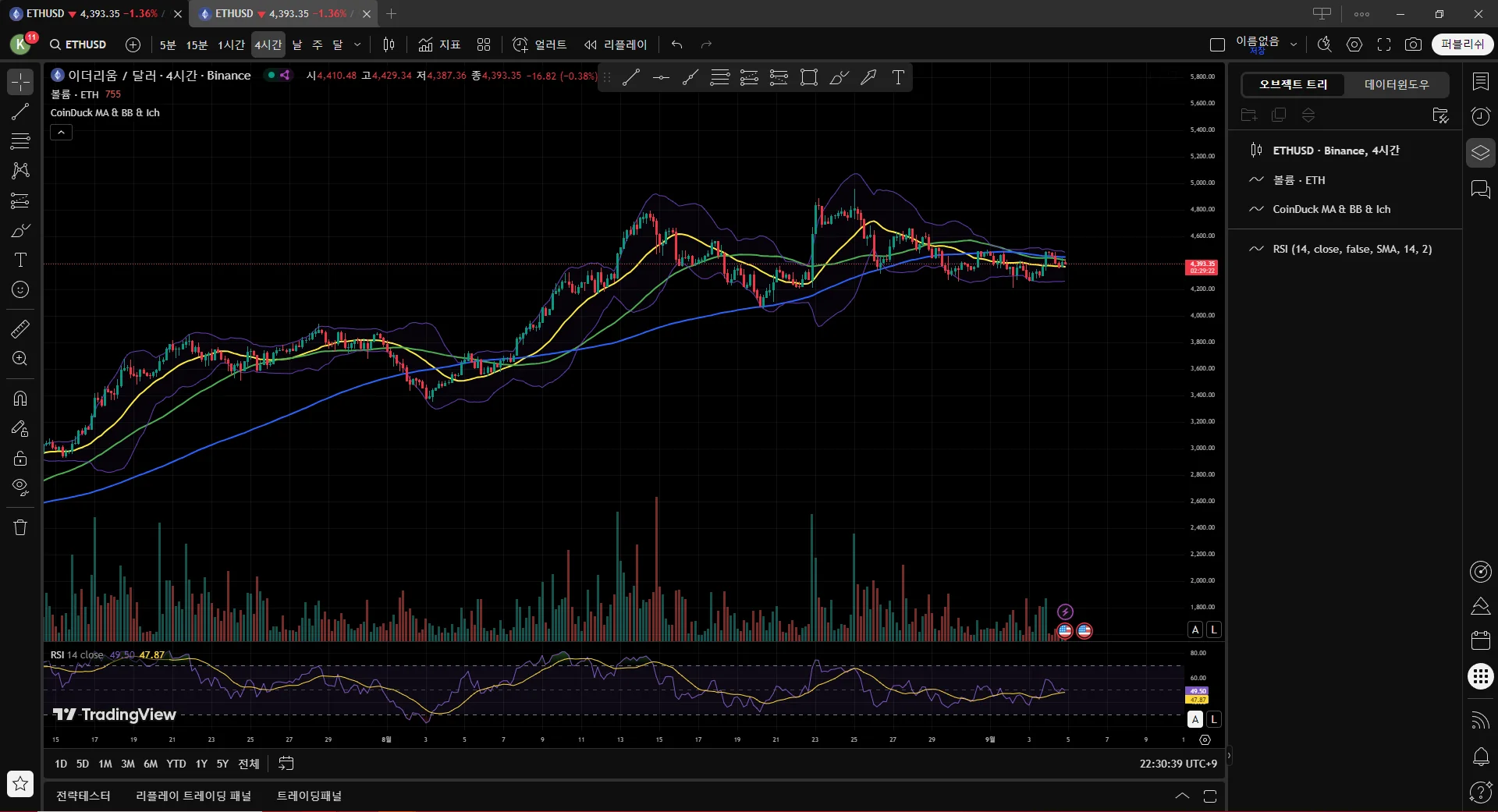 이평선, 밴드, RSI까지 추가된 모습입니다.