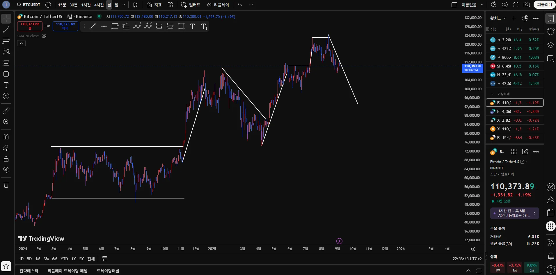 지지선과 저항선이 평행을 이루는 횡보 - 저항선 돌파 - 상향 추세선 - 추세 전환 - 하락 추세선 - 추세 전환 - 상향 추세선 - 약간의 횡보? - 상향 추세선 - 약간의 횡보? - 하향 추세선