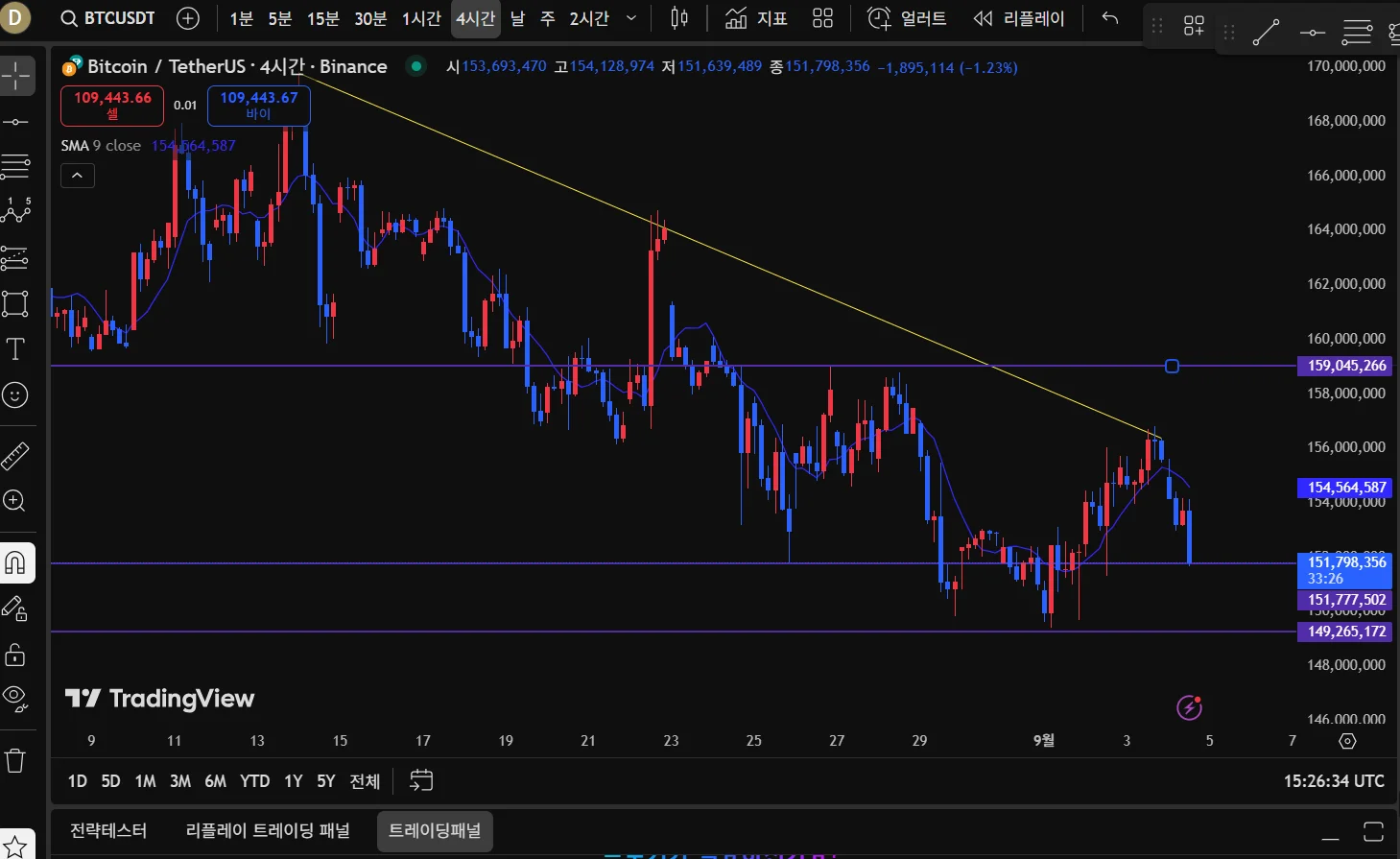 하락 추세선 아래에서 움직이고 있으며, 151,000K 지지선이 무너지면 148,000K까지 하락 가능성 있음.
