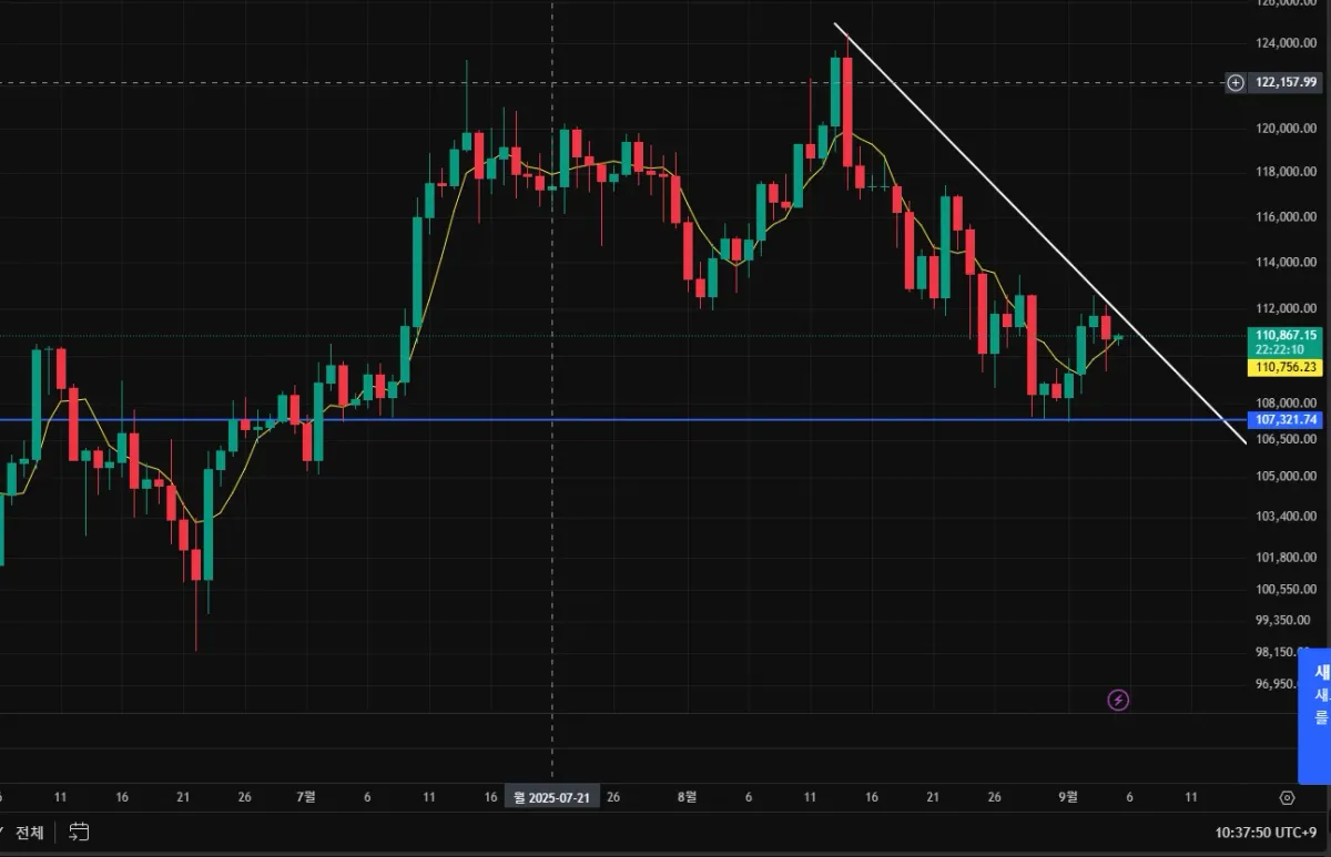 단순 이동 평균선 5이평 선으로 확인 및 지지 정항 라인 추세선 으로 확인 함 트레이딩뷰 에서 이것 저것 확인 해보았습니다.