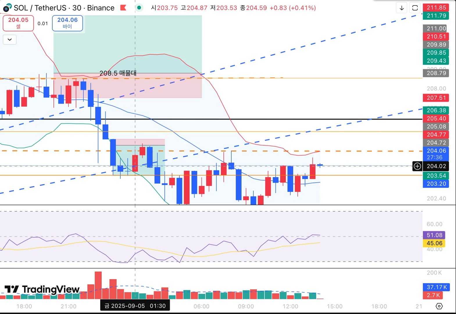 208.5 매물대 매도 저항을 받아내지 못하고 강하게 하락함. 해당 매물대를 강하게 돌파하였다면 롱 포지션으로 212까지 봤을 것 같음. 일봉 기준 206.4의 매수 매물대가 있기에 관망하였으나 거래량을 동반하며 강하게 하락으로 돌파함. 단기 하락의 신호로 보고 고배율 레버리지를 사용 후 포지션 진입. 익절가 : 피보나치의 0.5선 손절가 : 전고점.