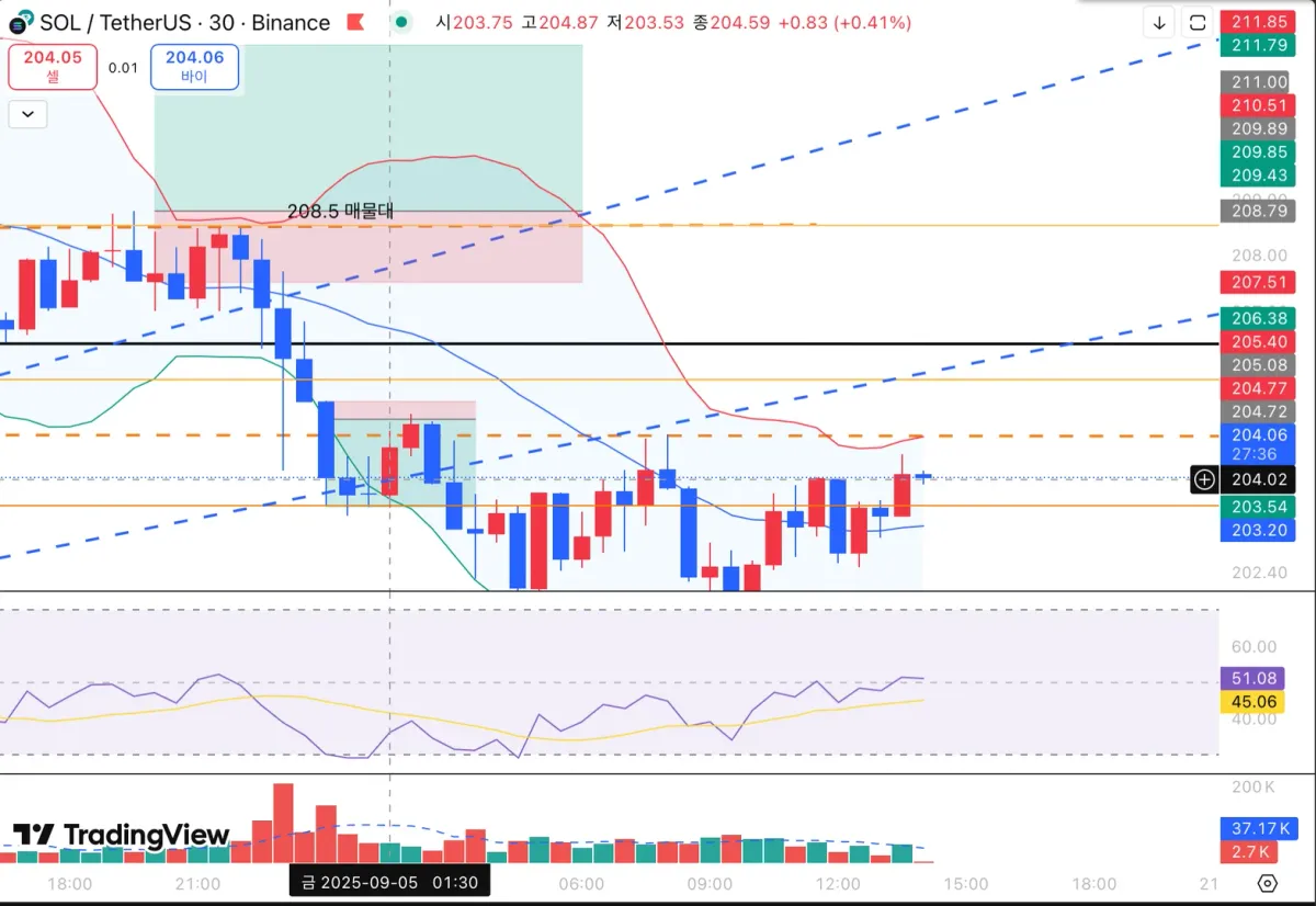 - 15분봉 기준 볼린저 밴드의 위에 잘 안착하였으며 208.5의 저항선에서 고전 중.