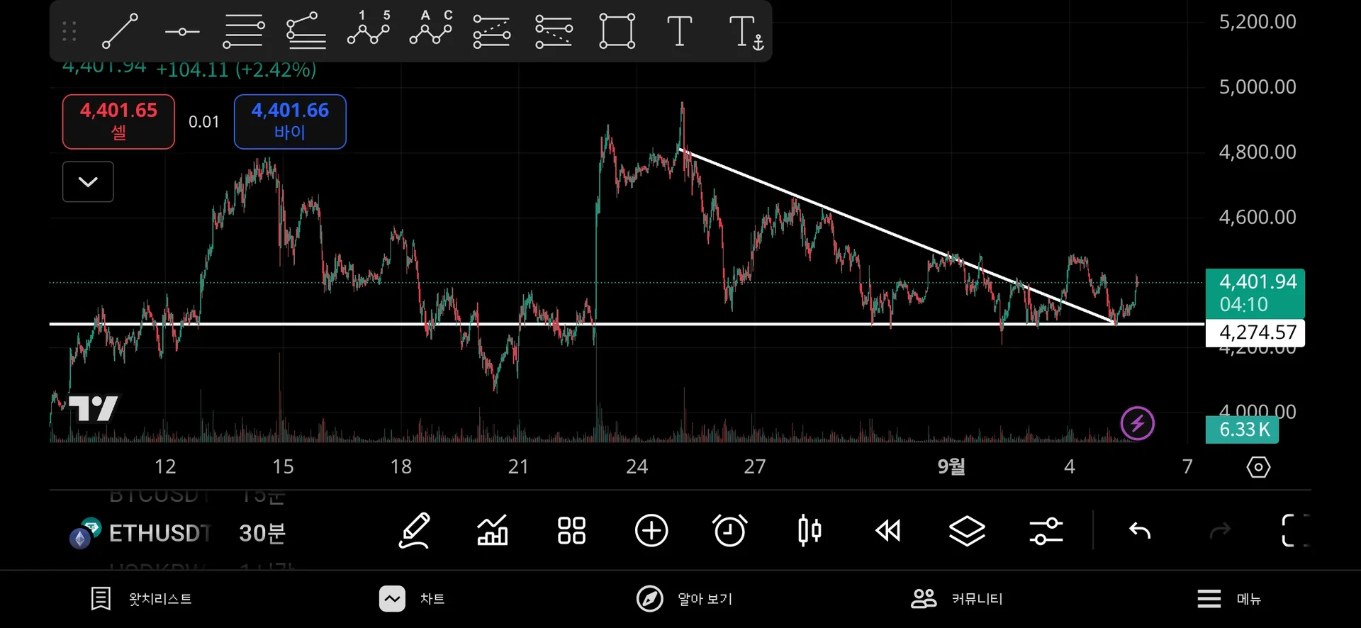 두번의 큰 양봉을 지지하는 지지선과 하락 추세선이 만나는 점에서 반발할 것 같아 매수했습니다