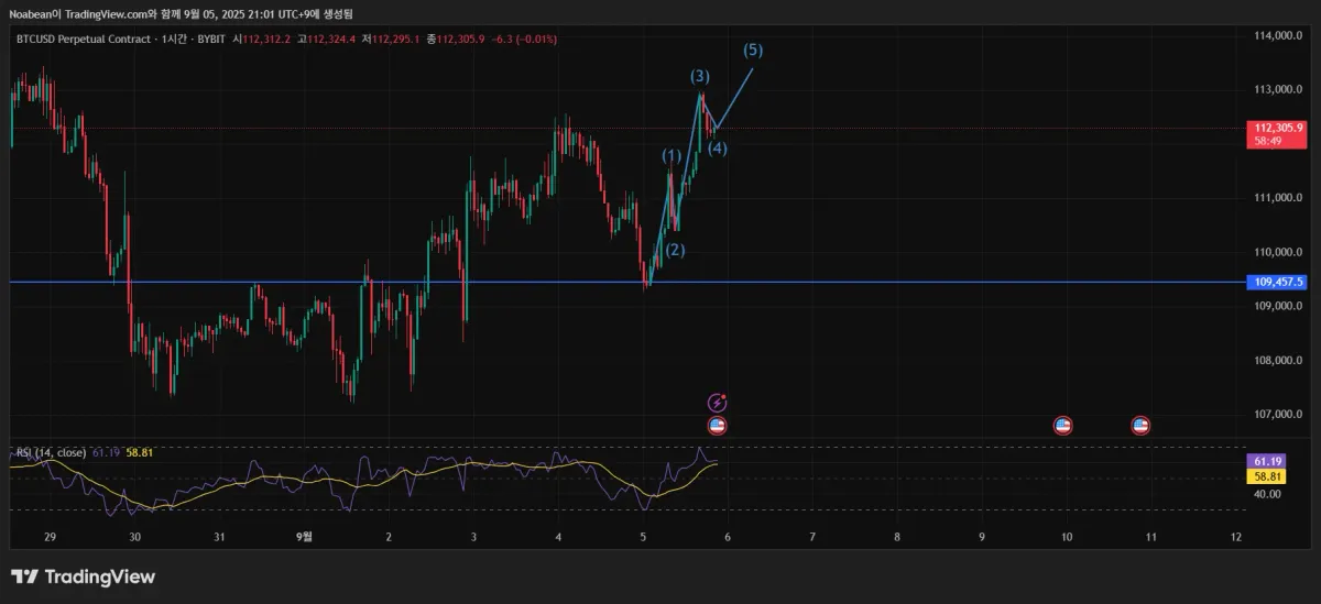 오늘은 엘리어트 파동 관점에서 5파동이 나올 가능성을 보고 포지션에 진입했다. 차트 상에서 1~4파까지 명확하게 형성된 흐름이 보였고, 현재는 4파 조정 이후 5파 상승이 이어질 구간으로 판단했다.