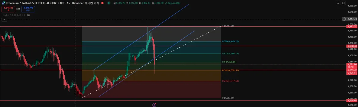 이후 상승 채널을 하방 돌파한 것을 포착했으나, 작은 피보나치를 그려보았을때, 0.382를 찍고 회복하지 못할듯해 관망하겠습니다.