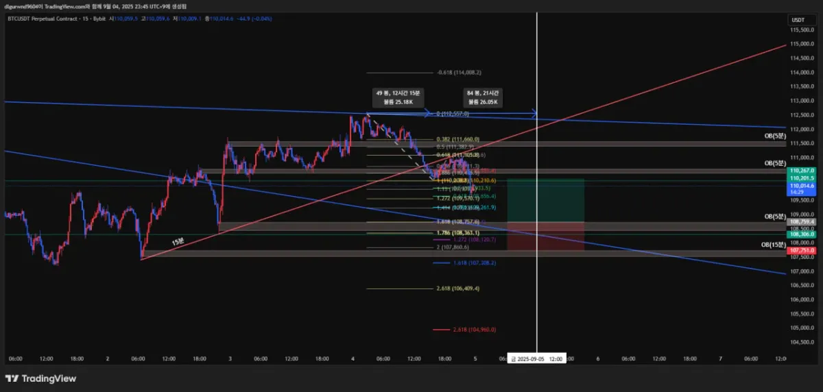3) 앞선 ABC 지점을 추세기반 피보나치를 그렸을 때 AB=CD가 되는 가격으로 진행 되면, 이전 5분봉에서의 오더블록과 맞닿는 가격으로 상승 전환 확률이 높다고 판단.