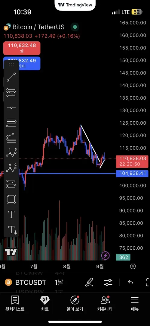 8월 중순부터 하락추세를 보이다가 다시 상승하는 추세가 보입니다. 잠깐 반등하는 모습을 보이다가 또 하락할 수 있다 생각하여 104 구간까지 떨어지면 매수할 거 같습니다!