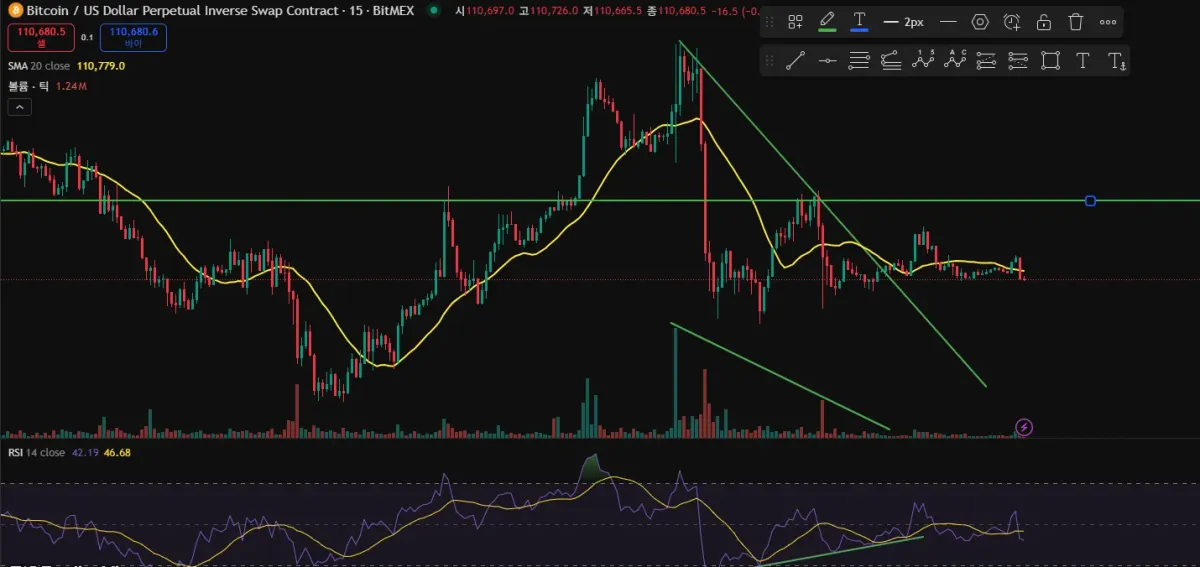 RSI 지수의 움직임은 과매도 구간에서 조금씩 저점이 상승하였다가 지수가 횡도하면서 RSI 도 중간 강도에서 방향성을 기다리는 구간으로 보여지네요 ..
