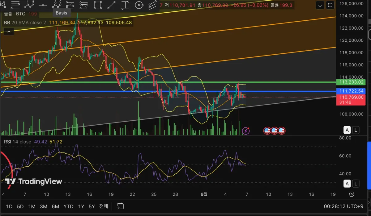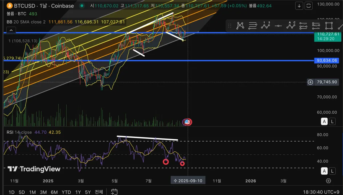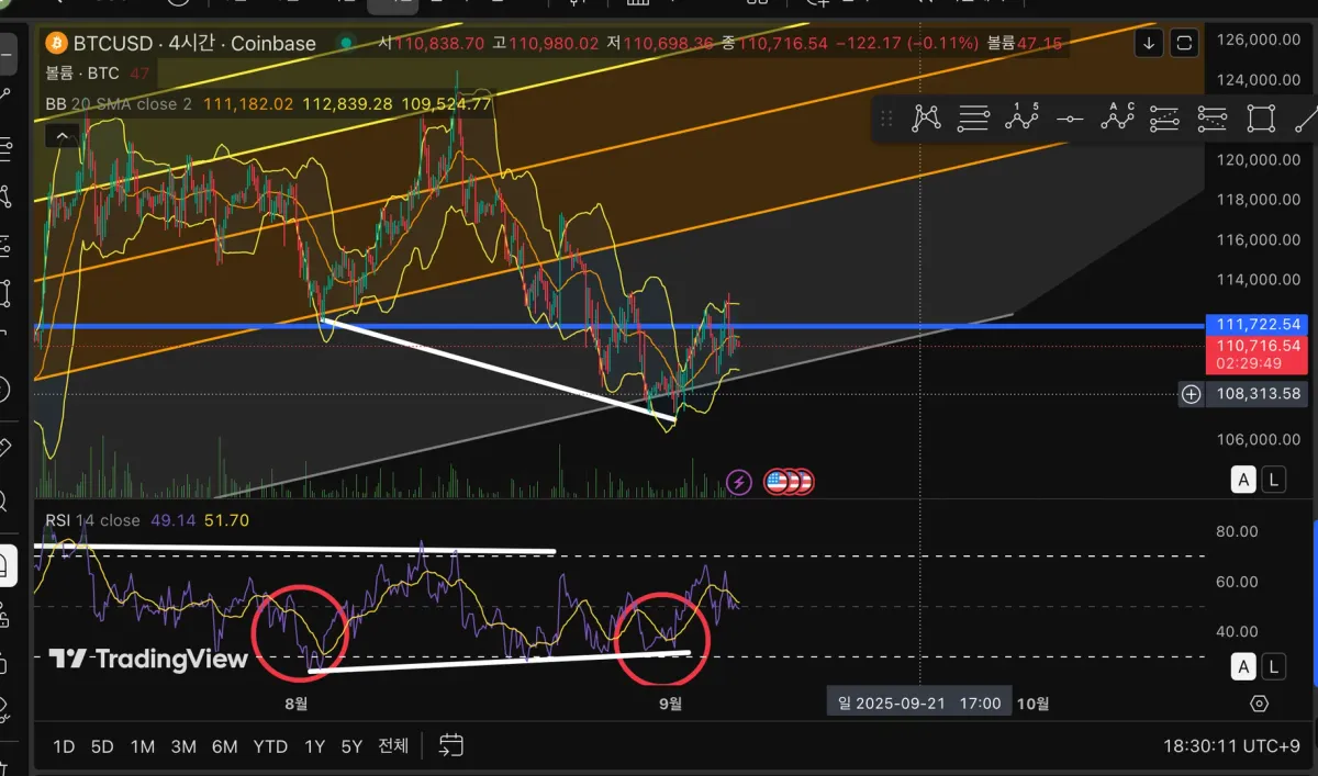 고점 기준으로 봤을때 가격은 올라가고 있으나, RSI는 감소하는것으로 보아 하방 다이버전스 발생중 -> 이로 인해 고점을 형성하고 내려갈 수 있다는것을 파악할 수 있으나, 그리기 나름이라는것을 확인할 수 있음. 내려갈때 일시적으로 숏을 칠 수 있으나, 다시 상승 가능서이 있으므로 무조건 수익구간 발생시 익절해야됨. 길게 끌고가다가 손실 발생할 수 있음.