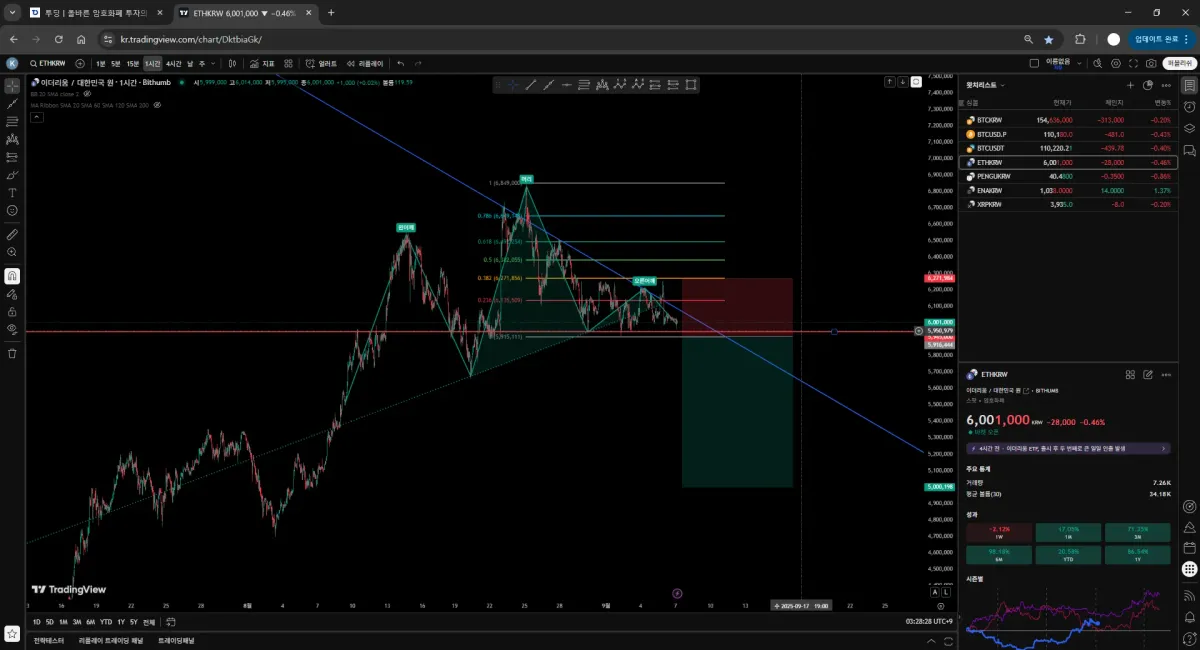 3. 주요 저항선을 5,945,000이라고 볼 때 추세와 함께 보았을 때 하락삼각형(디센딩 트라이앵글)의 모양을 띄고 있음.