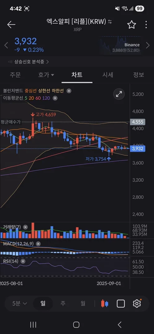 볼린저밴드 확인 상 가격은 횡보중으로 보인다.