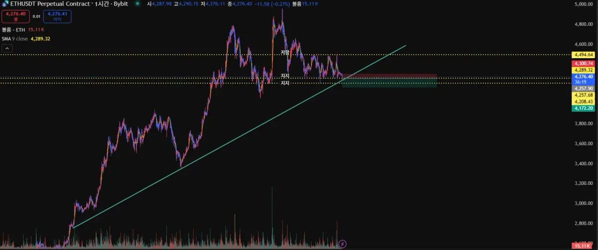 다른 보조 지표 확인하지 않고 단순하게 추세선만 사용하여 1시간 봉 기준으로 더블탑 패턴 넥라인 하방 이탈 확인 후 저점이 낮아짐과 동시에 추세선 하방 이탈한 것으로 확인이 되어 지지선 기점으로 숏포지션 진입했습니다.