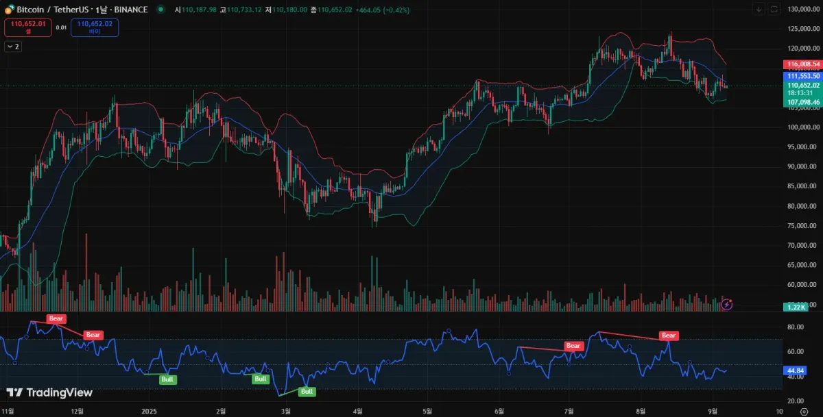 RSI지표와 함께 최근에 배운 볼린저 밴드도 트레이딩 뷰에 추가하였는데