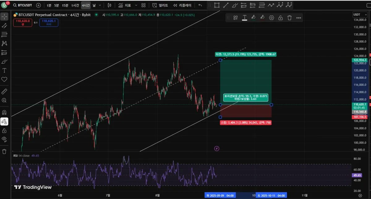 4시간봉 차트상 상승 채널에서 하단 터치후 반등하는 것 보고 진입.