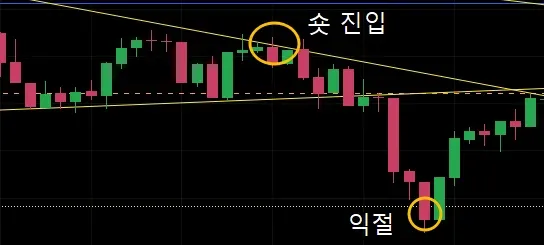 하락추세선을 보고 숏 진입 후 그려놨던 지지선 이탈 확인, 2차 지지선 익절