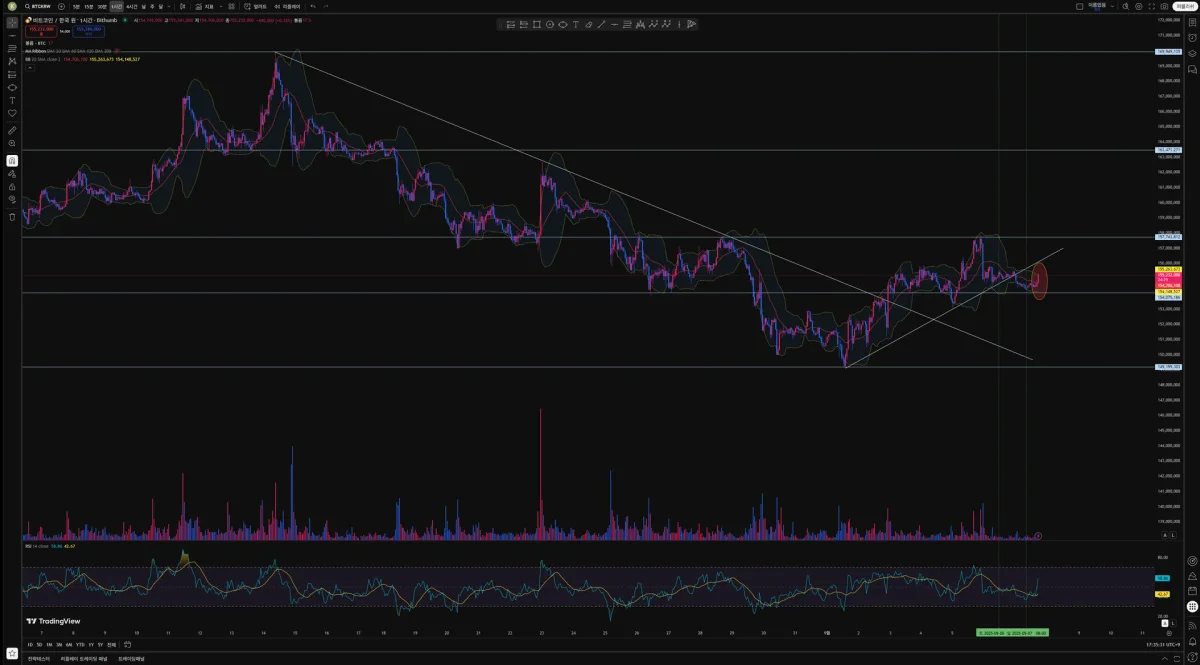 볼린저 밴드의 베이시스가 20 이평선 이므로 나머지의 이평은 삭제하고 보조지표 RSI를 넣었습니다.