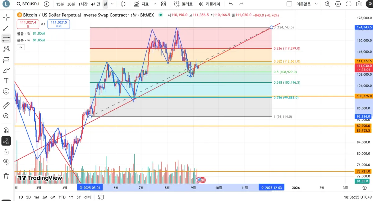 가격이 피보나치 0.5 또는 0.618구간에 도달했을 때 반등 신호를 확인하고 매수 포지션에 진입하면 될 거 같습니다. 손절은 0.618 구간 아래에 하거나 가장 낮은 저점 아래로 설정해보겠습니다.