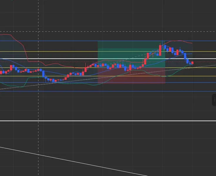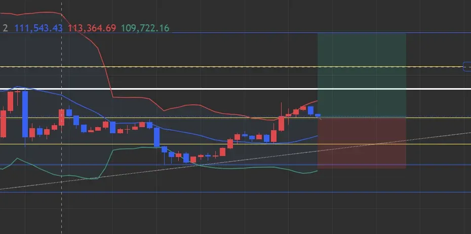 1일 기준으로 봤을 때 하락 후 상승으로 전환하려는 조짐이 보여짐. 한번 더 하락 후 상승할 것으로 예측됨. 이전 저점인 107220에 손절라인 걸고 진입함.
