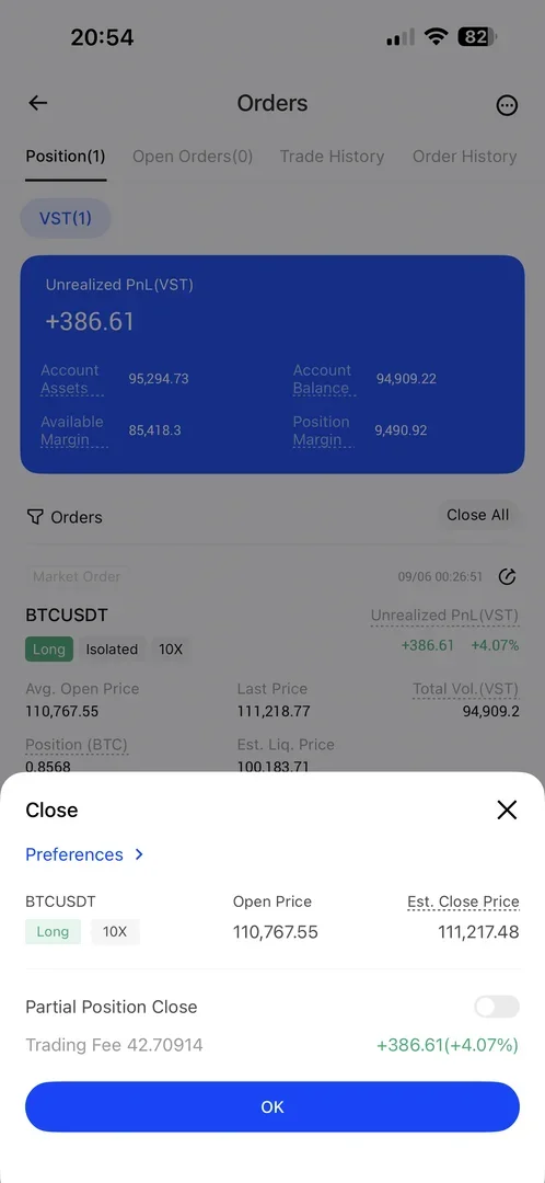 추세선을 그렸을때 조항선을 뚫고 올라가 숏포지션을 잡으려 했으나 시간을 두고 지켜본 결과 거래량이 많아지고 새로운 추세선의 저항선을 넘지 못함과 동시에가격이 급격히 떨어졌습니다. 이에따라 볼린저밴드에 지지를 받고있는 모습을 보아 10배 롱포지션을 진입하여 4%의 이익을 봤습니다