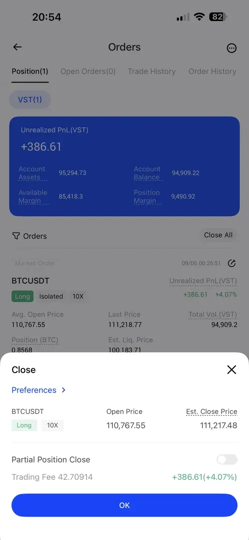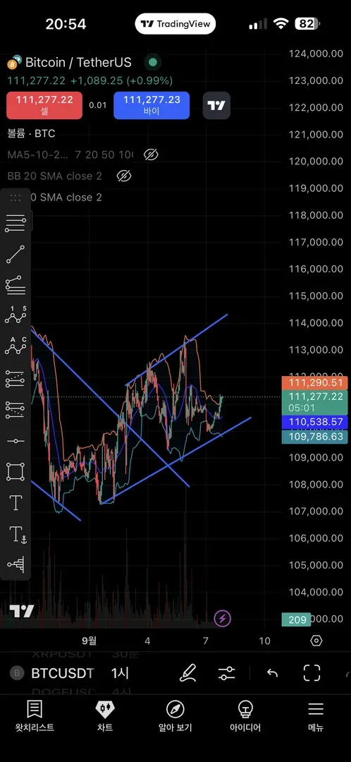 추세선을 그렸을때 조항선을 뚫고 올라가 숏포지션을 잡으려 했으나 시간을 두고 지켜본 결과 거래량이 많아지고 새로운 추세선의 저항선을 넘지 못함과 동시에가격이 급격히 떨어졌습니다. 이에따라 볼린저밴드에 지지를 받고있는 모습을 보아 10배 롱포지션을 진입하여 4%의 이익을 봤습니다
