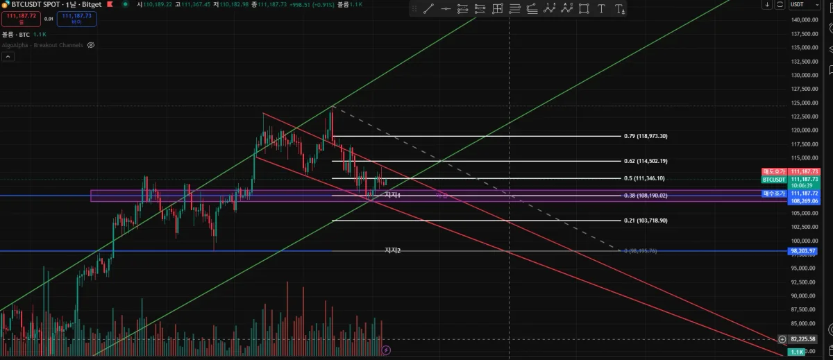 - BTC가격이 하락 추세선 하단부에 접근하고 지지1선에서 지지를 받는다면,