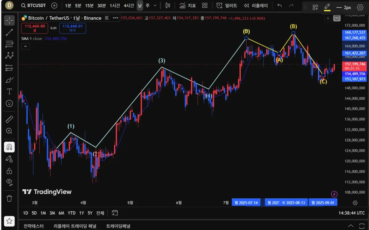 상승 5파동이 마무리된 뒤 현재는 ABC 조정파의 C 구간까지 진행된 상태로, 반등 가능성과 추가 하락 가능성이 공존하는 국면으로 보입니다.