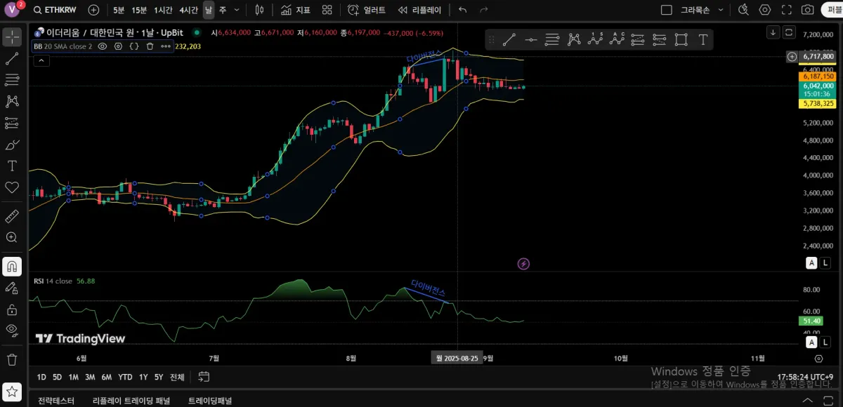 이더리움 날봉기준으로 하였고 볼린저밴드와 다이버전스지표를 통하여 매매를 해보겠습니다.
