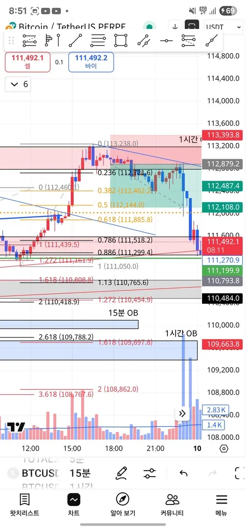 1) 이전 파동을 확장값으로 봤을때 1.272와 1.618 자리가 오더블럭 상단에 겹쳐있었고