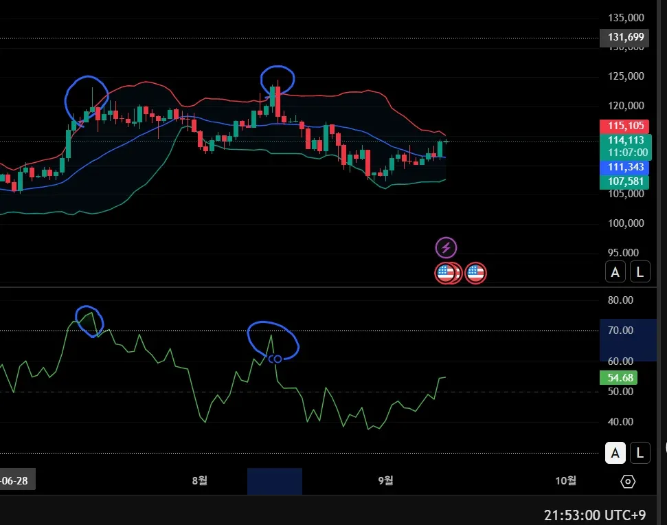 볼린저 밴드가 벗어난 이후에는 다시 밴드 안으로 돌아오는데 중앙선이 지지하기도 하고 저항하기도 하는것 같습니다.
