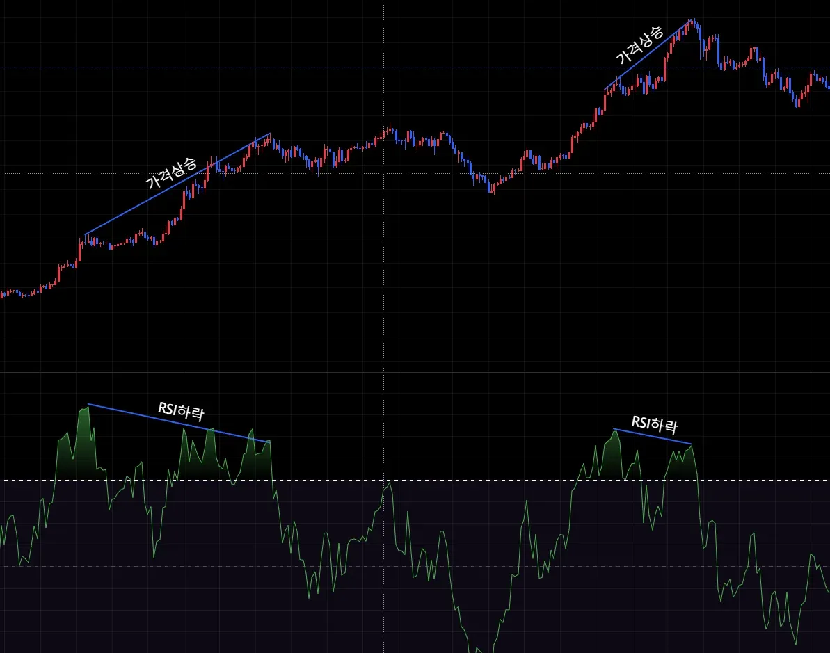 두번째 다이버전스는 가격은 상승했지만 RSI는 하락하면서이후 가격이 하락하는 모습입니다.