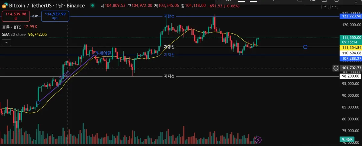 상승 추세선(보락색 지지선) 추세이탈-> 하얀색으로 표시된 지지, 저항선을 따라 횡보하다가 이후 파란색으로 이루어진 지지,저항선을 따라 횡보하고 있는 양상이라고 생각하여 이렇게 표시해봤습니다.