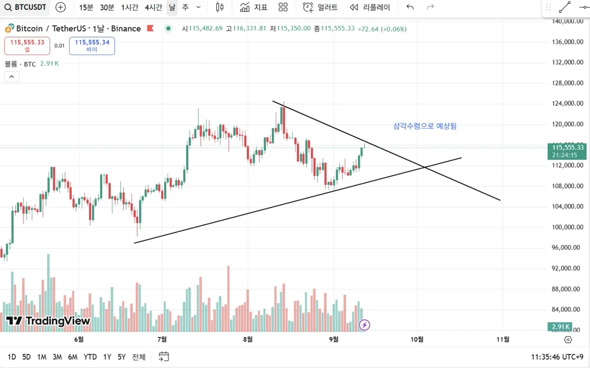 비트코인 차트가 삼각수렴으로 상승할 것으로 예상되어 작도후 캡처하여 올립니다.