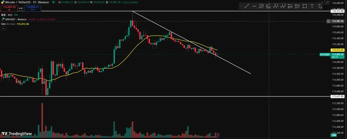 저항선은 116,331 부분으로 지정했는데 윗꼬리를 달고 하락해서 의미가 있다고 판단하여 저항선으로 지정했습니다.