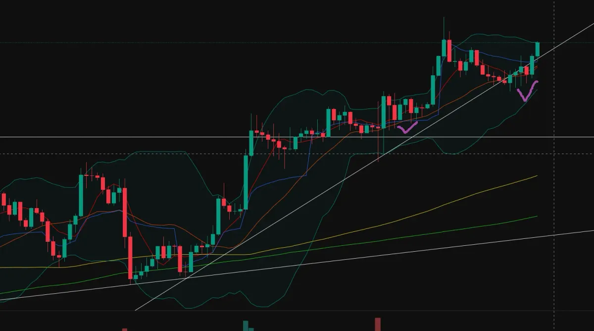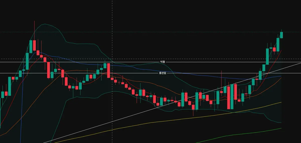 4시간 봉 기준 추세선이 캔들 꼬리에 예쁘게 지지선으로 걸림 + 20일 이평선(주황색 선)도 지지선 역할을 해주는 걸 확인했음.